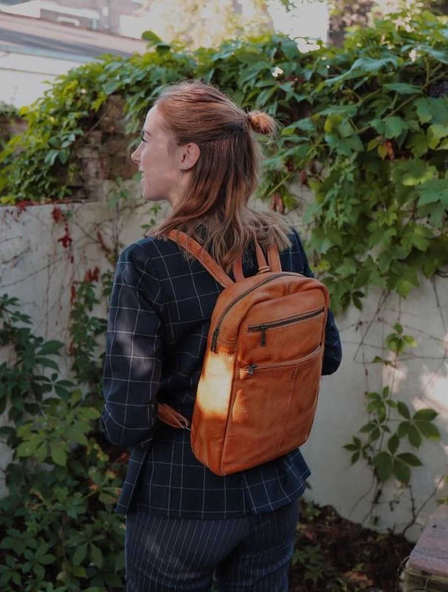 Mooie grote leren rugzak uit de Callisto-Pelle serie van Bear Design. De tas is gemaakt van prachtig rundleer. Het ruime hoofdvak is afsluitbaar met een rits. In het hoofdvak zit een ritsvak, een steekvakje en 2 pennenlussen. Tevens zit in het hoofdvak een gewatteerd tabletvak (24 x 27 cm). Op de voorzijde van de tas zitten twee ruime ritsvakken. Op de achterzijde zit ook nog een groot ritsvak. Aan de bovenkant zit een handvat/lus waarmee je de rugzak makkelijk en snel op kunt pakken of even in de hand kunt dragen. Het rugpand is volledig gewatteerd voor optimaal draagcomfort. De twee schouderbanden zijn verstelbaar.