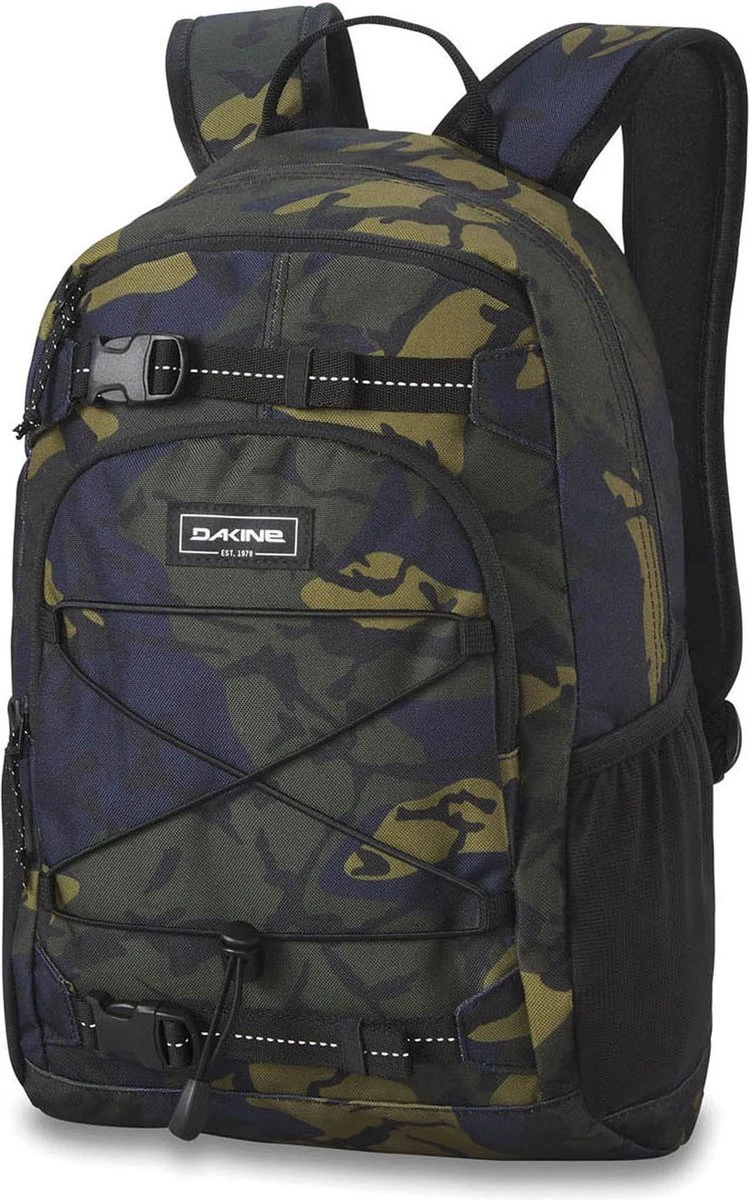 Kinderen kunnen niet achterblijven op de Dakine trend. Deze stoere tas uit de Grom serie heeft de even zo stoere camo print. De kliksluitingen en het elastiek voegen ook toe aan dit uiterlijk. De buitenzijde heeft voor het organiseren twee ritsvakken en twee steekvakken. Die steekvakken zijn prettig voor het meenemen van flessen. De binnenkant heeft een adreslabel.