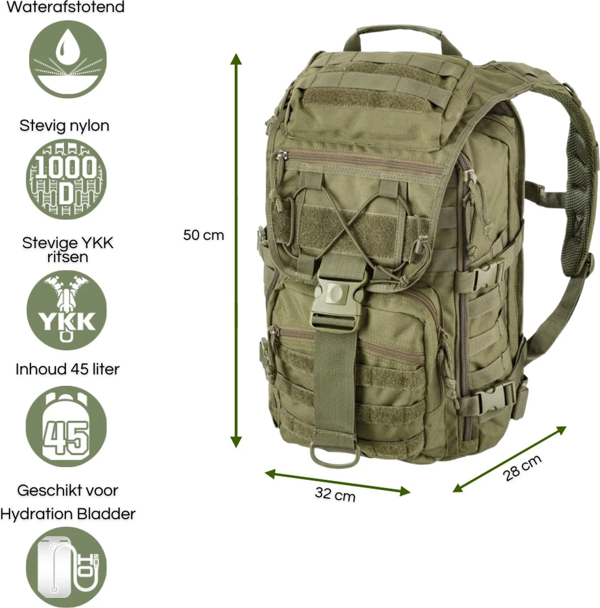 Een erg stevige en functionele legerrugzak vanwege het gebruikte materiaal 1000 Denier, de vele vakken en het externe MOLLE-system.