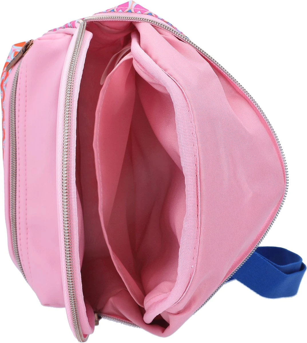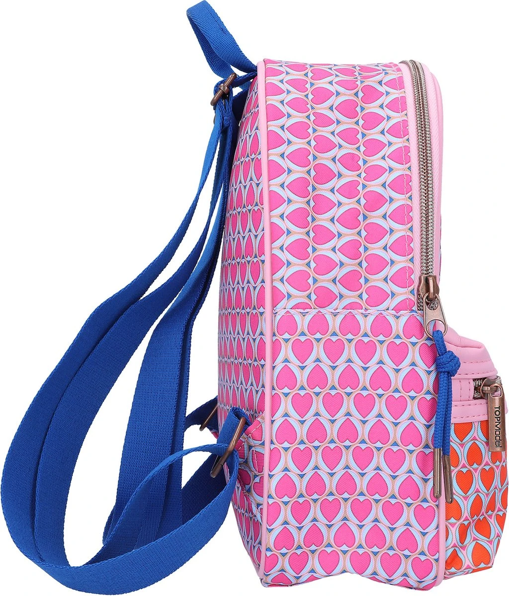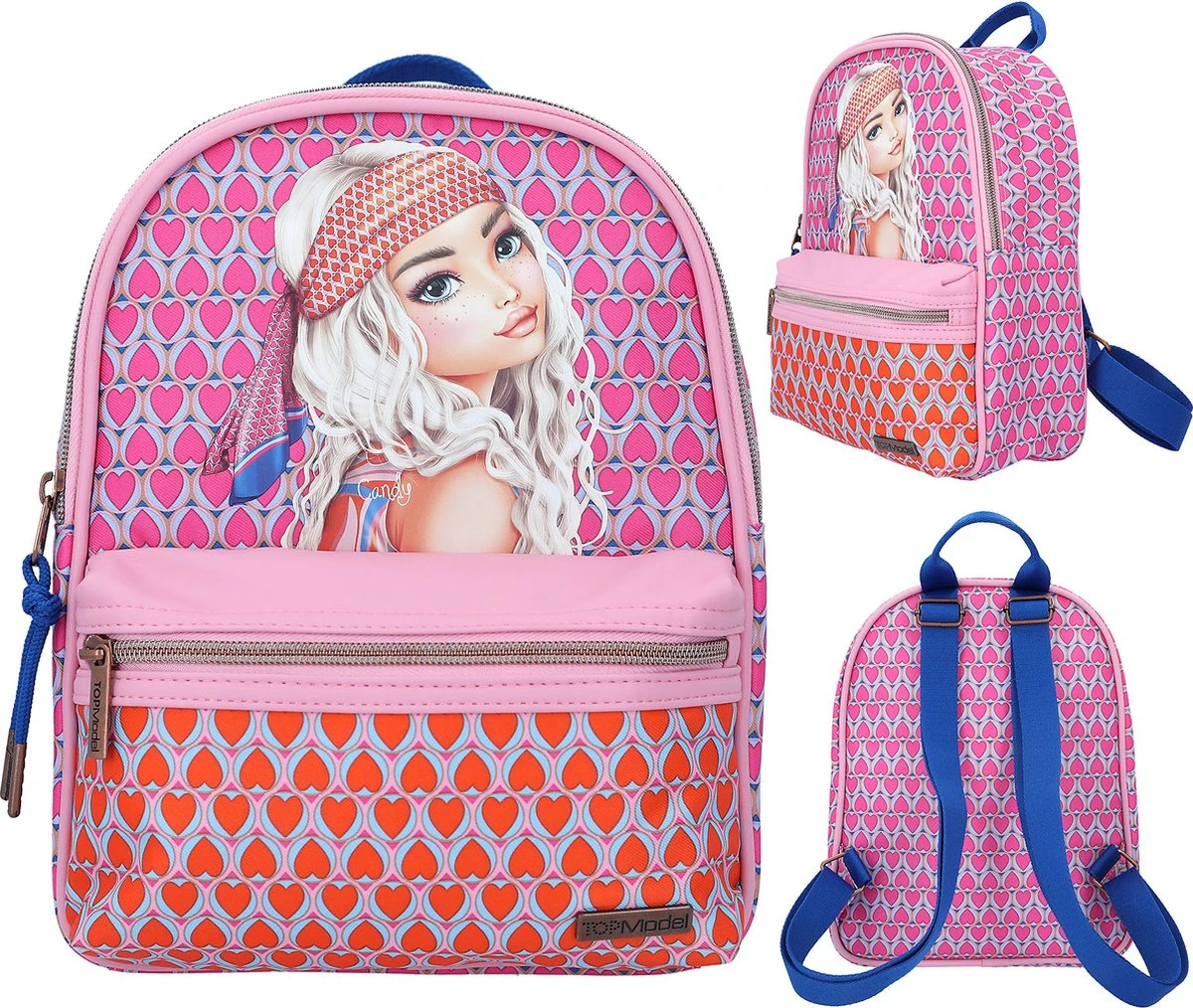 Deze kleine rugzak is echt een blikvanger: toffe rood- en rozetinten, een all over print van hartjes en een prachtige TOPModel print die aan de coole hippietijd doet denken. Met blauwe schouderbanden die in lengte verstelbaar zijn en een vakje voorop met rits. Materiaal: 100% polyester.