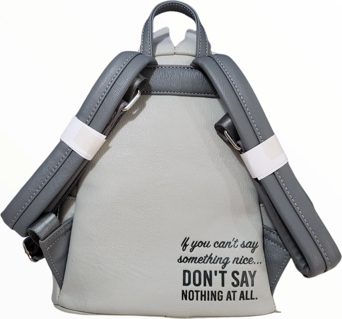 Rugtas Thumper Cosplay. Fraaie kunstlederen tas uit de Disney-collectie van het Amerikaanse designermerk Loungefly. De tas heeft uiterlijk van het aandoenlijke konijntje Stampertje uit de Disney-klassieker Bambi. De tas heeft een voorvakje met ritssluiting. De tas is voorzien van twee verstelbare schouderbanden en een bijpassende binnenvoering.