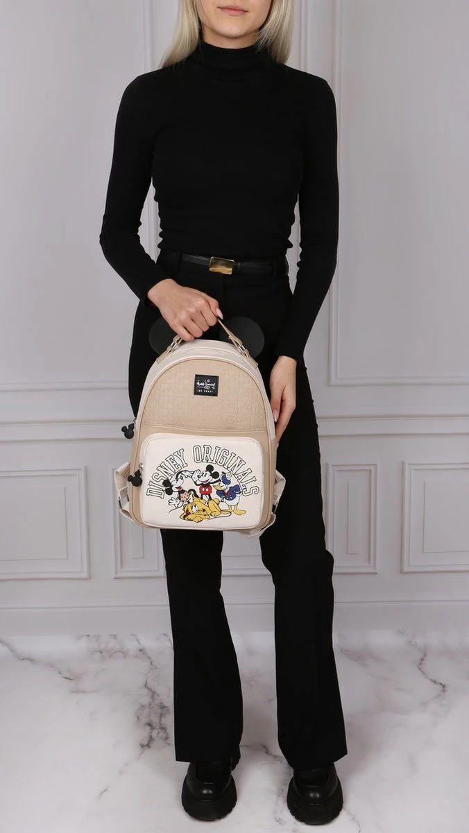 Beige rugzak van imitatieleer, bedrukt met afbeeldingen van Mickey Mouse and Friends. In de grote kamer en aan de voorkant is er een klein vak met ritssluiting en een open vak, ideaal voor handige spullen. Zachte, verstelbare bandjes op de rug om de schouders en rug te beschermen tegen te zwaar tillen, handvat bovenaan. Perfect om alle meest noodzakelijke dingen in op te bergen, maar niet geschikt voor A4. Hoogte: 32 cm, Breedte: 24 cm, Diepte: 11 cm Op onze andere advertenties vind je een bijpassende reistas in hetzelfde patroon.