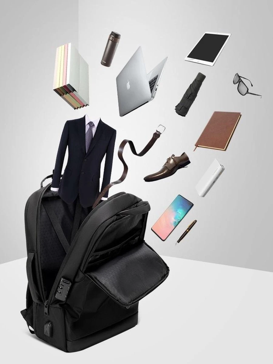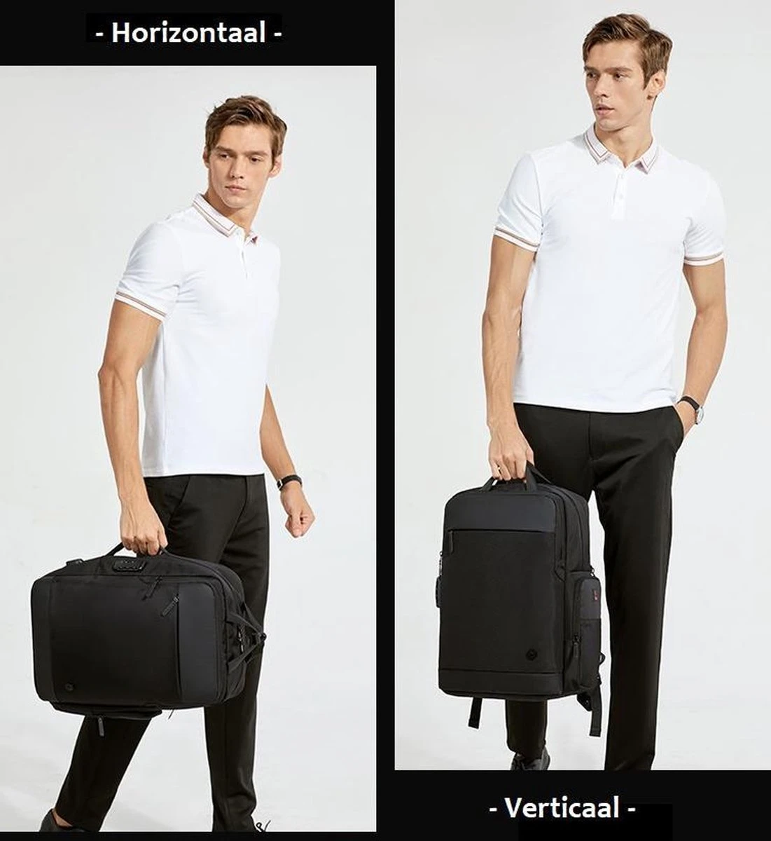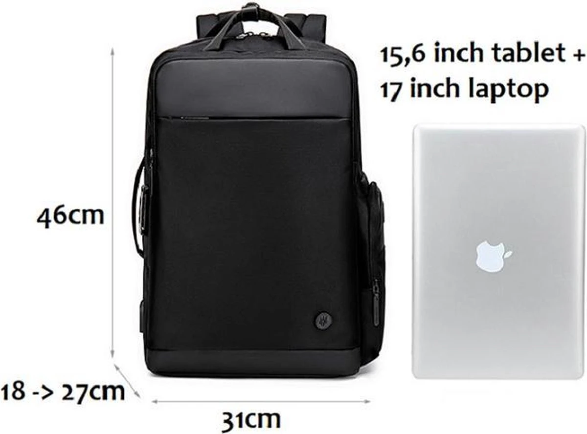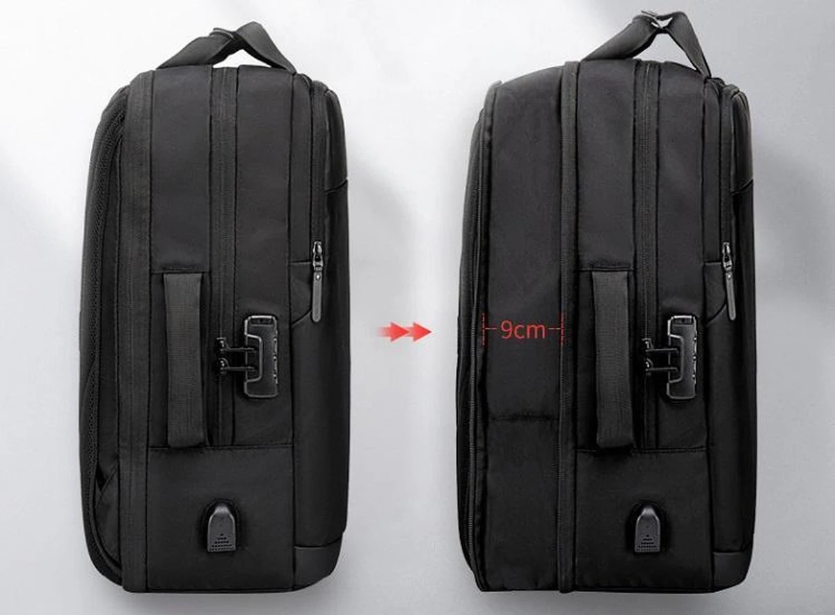 Deze rugzak mag je gerust ‘multifunctioneel’ noemen en heeft zowat alles wat van een rugzak mag verwacht worden: 4 zones met een stevige rits afgesloten, USB-oplaadpoort, geïsoleerd vak voor water(thermo)fles (inclusief), snijbestendig en waterdicht materiaal, anti-diefstalslot, stevige schouderbeugels met pasjeshouder, ademende stof aan rugzijde, gekruiste spanbanden, vak voor 17 inch laptop en 15,6 inch tablet met schuimbescherming, ruimte uit te breiden van 25l naar 37l, trolleyriem, handvat aan bovenkant en zijkant. Je kan hem dus in vele omstandigheden gebruiken.
