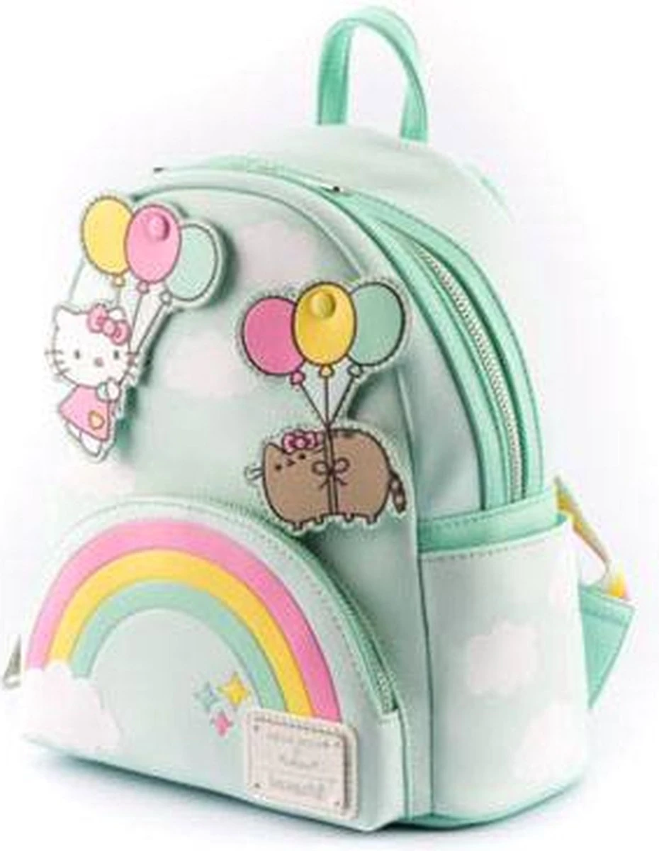 Backpack / rugzak met Balloons and Rainbow van Pusheen x Hello Kitty.De binnenkant is bedrukt met wolken.Met opdruk van Pusheen en Hello Kitty met ballonnen en een regenboogKan gesloten worden met een rits. Met extra vakje aan de buitenkant met rits.Merk: LoungeflyMateriaal: polyester / imitatieleerAfmetingen: 23 x 27 x 11 cm