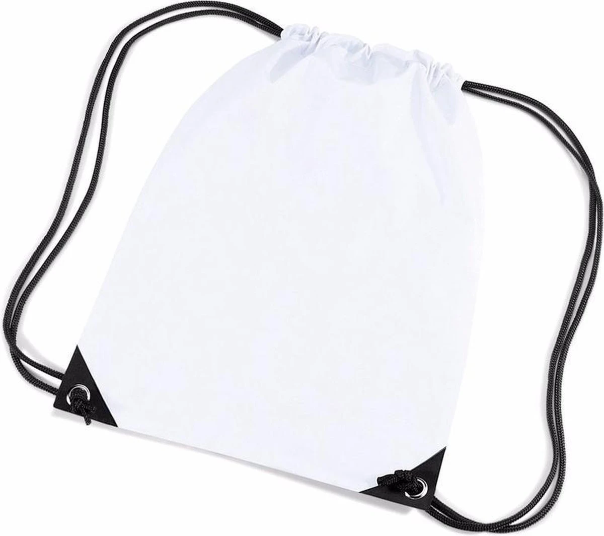 Nylon gymtas in het wit van waterafstotende stof en reigkoord. Inhoud: 12 liter. Afmeting: 45 x 34 cm.