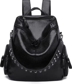 Op zoek naar een alledaagse zwarte rugzak-schoudertas die net zo stoer is als jij? Zoek niet verder. Deze stijlvolle Rugzak Lola Zwart voor dames is de perfecte mix van praktisch en modieus, met zes vakken, waterafstotende stof in leerlook en verstelbare schouderbanden. Of je nu naar je werk of naar school gaat, deze glanzende zwarte tas zorgt ervoor dat je er verzorgd uitziet en georganiseerd blijft. Maak je klaar om de wereld in stijl te veroveren! Deze schoudertas is voorzien van een extra afneembare schouderband met metalen studs.