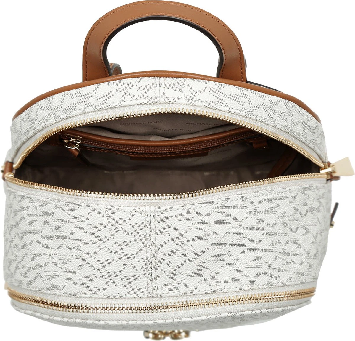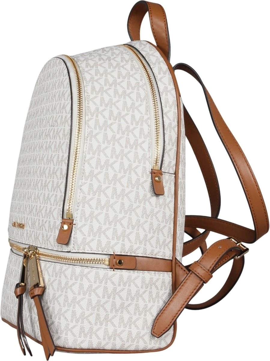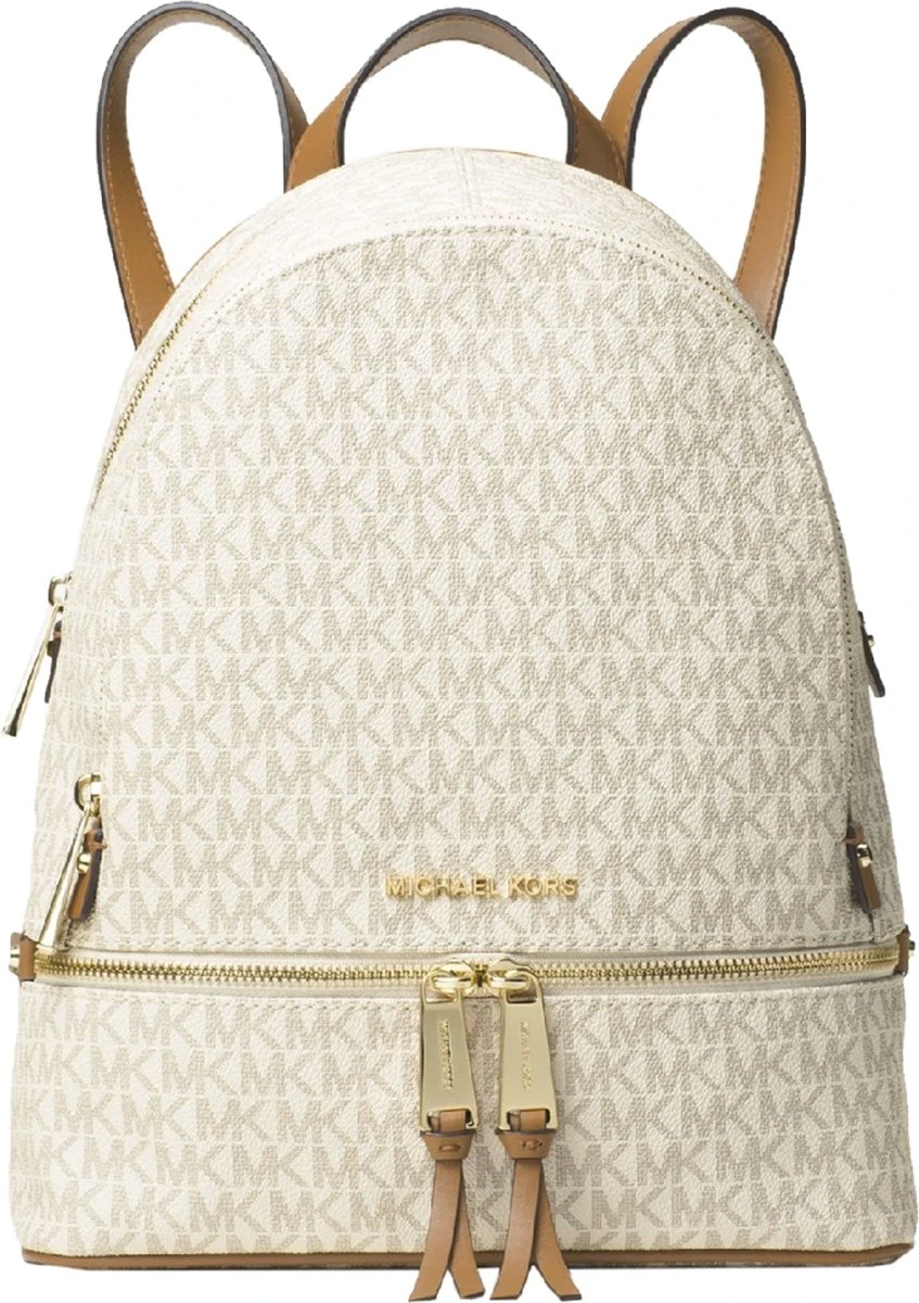 Deze Michael Kors Rhea rugzak heeft ondanks het bescheiden formaat meer dan voldoende opbergruimte. De tas is gemaakt van stevig kunstleder met een ruwe, voelbare structuur en is geheel voorzien van een opvallende logoprint. De snijvlakken van de lederen draagbanden hebben een contrasterende kleur uitgevoerd, de lederen patches hebben opvallende gouden studs en bovendien is de tas voorzien van chique lichtbruine piping. Dit geeft in combinatie met de subtiele goudkleurige details een luxueuze en eigentijdse uitstraling. Deze damesrugtas heeft twee openritsbare voorvakken en een hoofdvak. Het hoofdvak heeft vier zijvakjes van verschillende grootte en zowel een breed open als afsluitbaar zijvak voor smartphone of portemonnee.