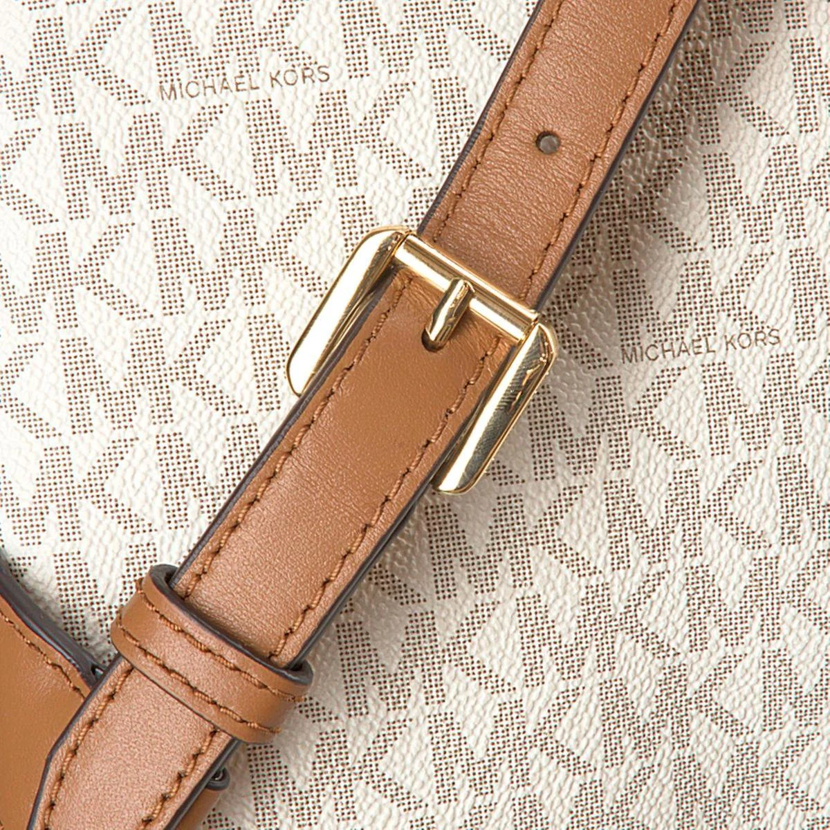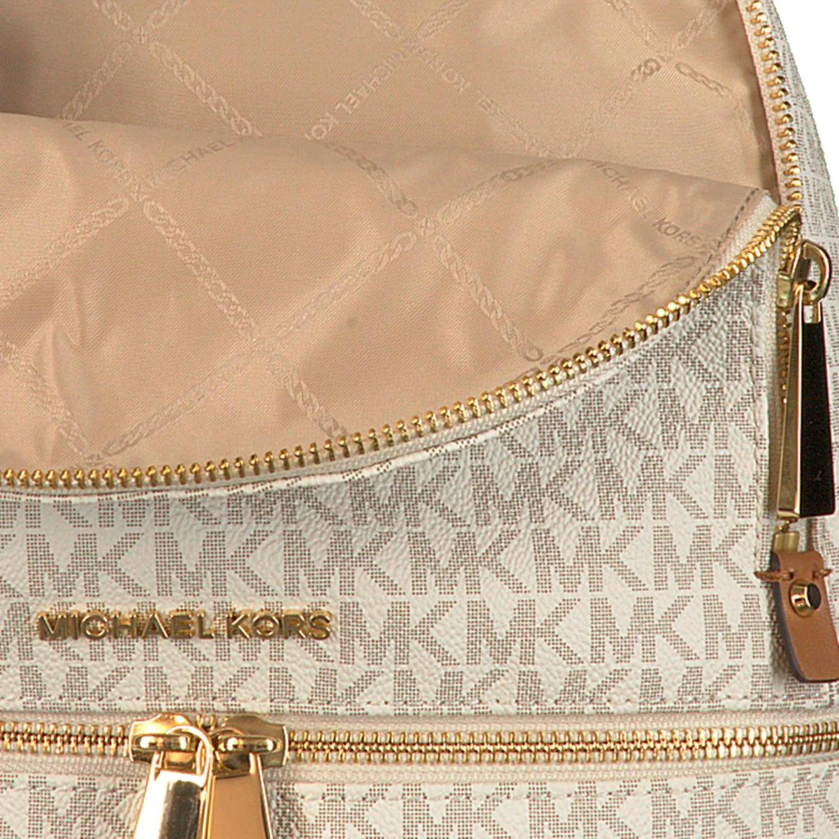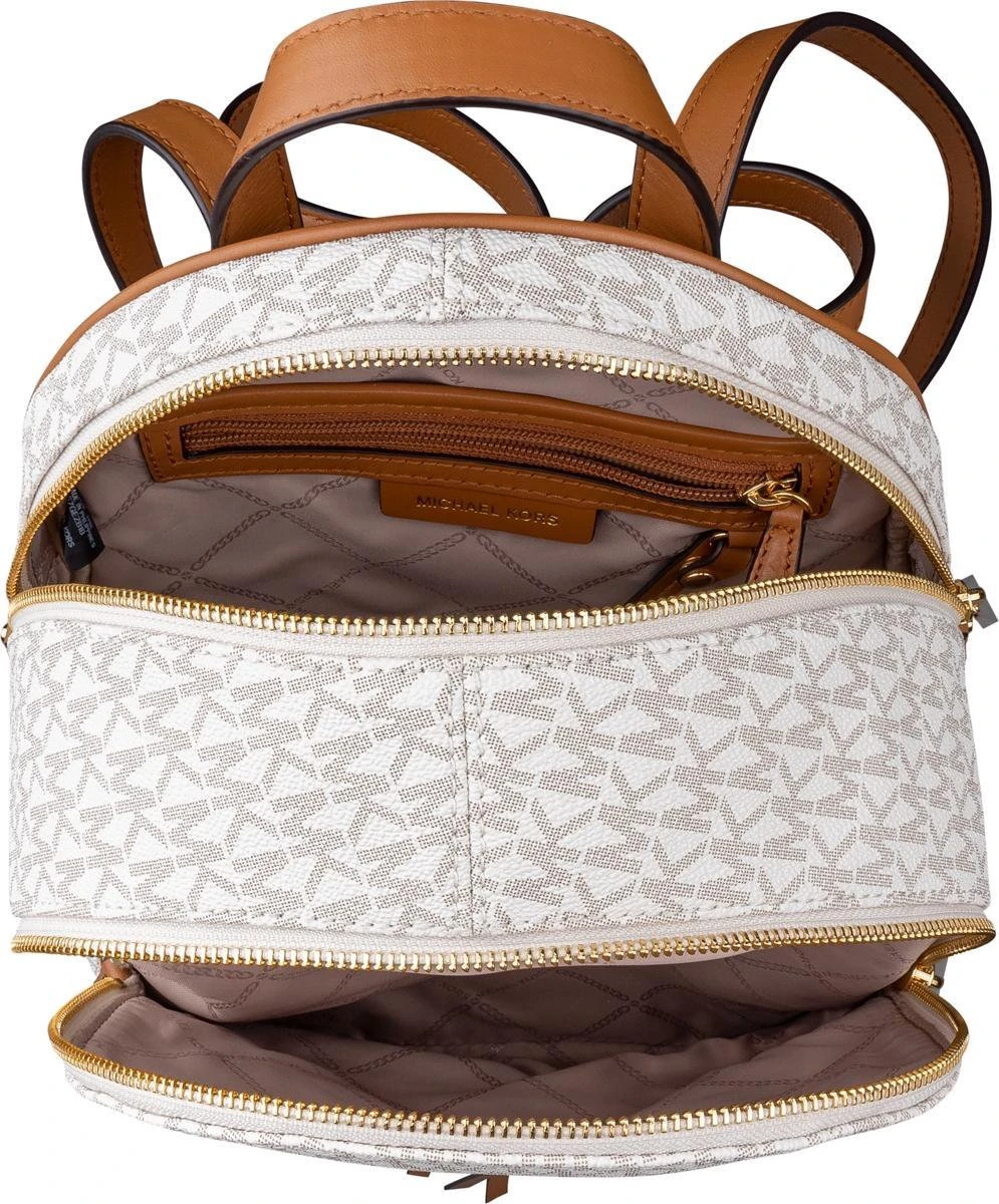 Deze Michael Kors Rhea rugzak heeft ondanks het bescheiden formaat meer dan voldoende opbergruimte. De tas is gemaakt van stevig kunstleder met een ruwe, voelbare structuur en is geheel voorzien van een opvallende logoprint. De snijvlakken van de lederen draagbanden hebben een contrasterende kleur uitgevoerd, de lederen patches hebben opvallende gouden studs en bovendien is de tas voorzien van chique lichtbruine piping. Dit geeft in combinatie met de subtiele goudkleurige details een luxueuze en eigentijdse uitstraling. Deze damesrugtas heeft twee openritsbare voorvakken en een hoofdvak. Het hoofdvak heeft vier zijvakjes van verschillende grootte en zowel een breed open als afsluitbaar zijvak voor smartphone of portemonnee.