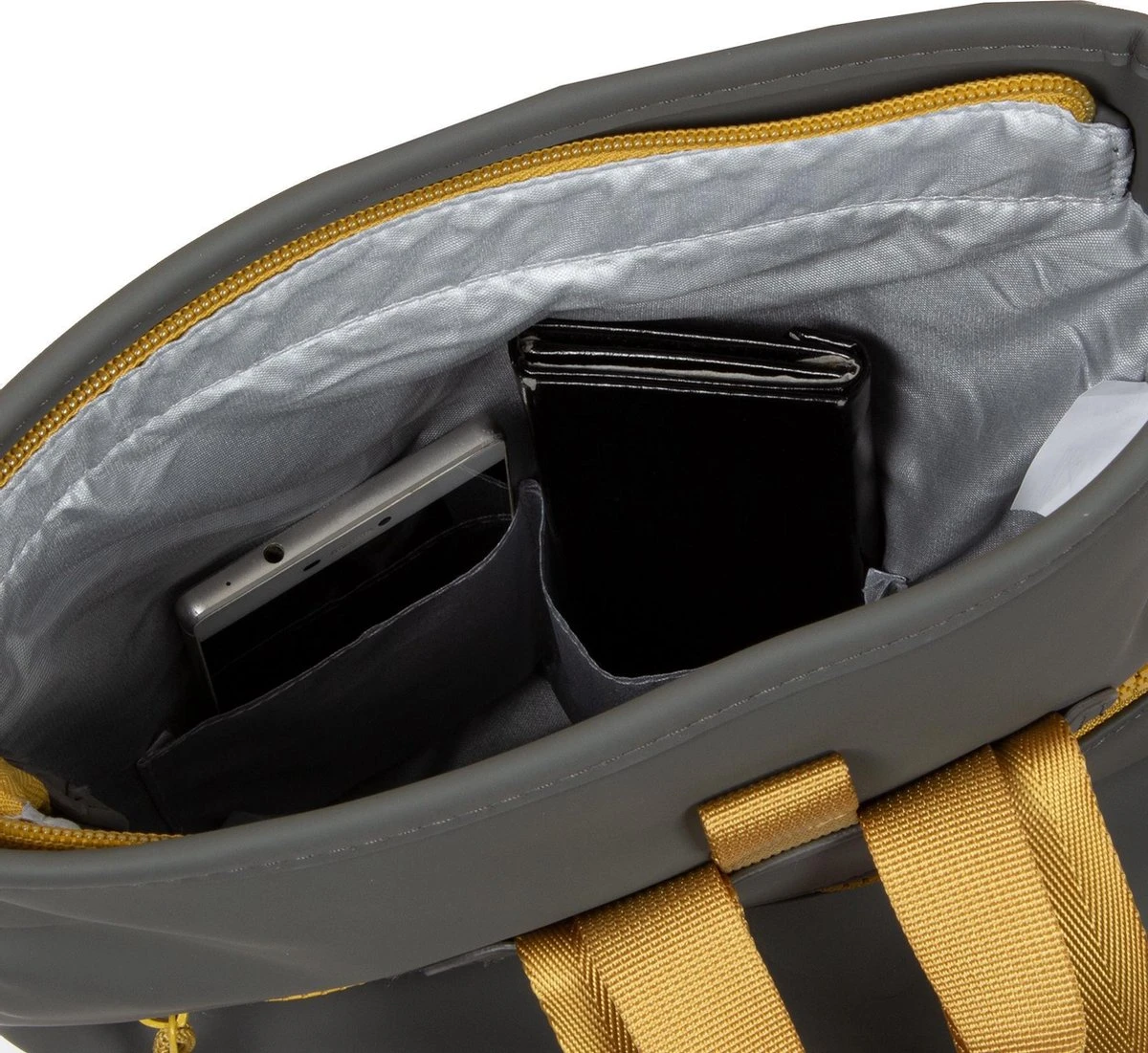 Deze trendy waterafstotende rugtas draagt comfortabel door het lichtgewicht en de gewatteerde schouderbanden. Toch behoudt deze rugzak zijn charme door de fijne vormgeving. Het hoofdvak is eenvoudig te vergroten of verkleinen door het oprol gedeelte aan de bovenkant. Hierdoor kun je tot 10 cm meer ruimte creëren. Het hoofdvak is afsluitbaar met een stevige rits en een gespsluiting die als een strook, in contrasterende kleur, doorloopt in het design. In het zilverkleurige hoofdvak zitten twee insteekvakjes en een ritsvakje voor bijvoorbeeld je telefoon. Op de voorkant en achterkant van de rugzak zit ook een extra ritsvak, handig voor kleine spullen waar je snel bij moet kunnen. Het stevige handvat zorgt ervoor dat de tas eenvoudig op te pakken en op te hangen is.