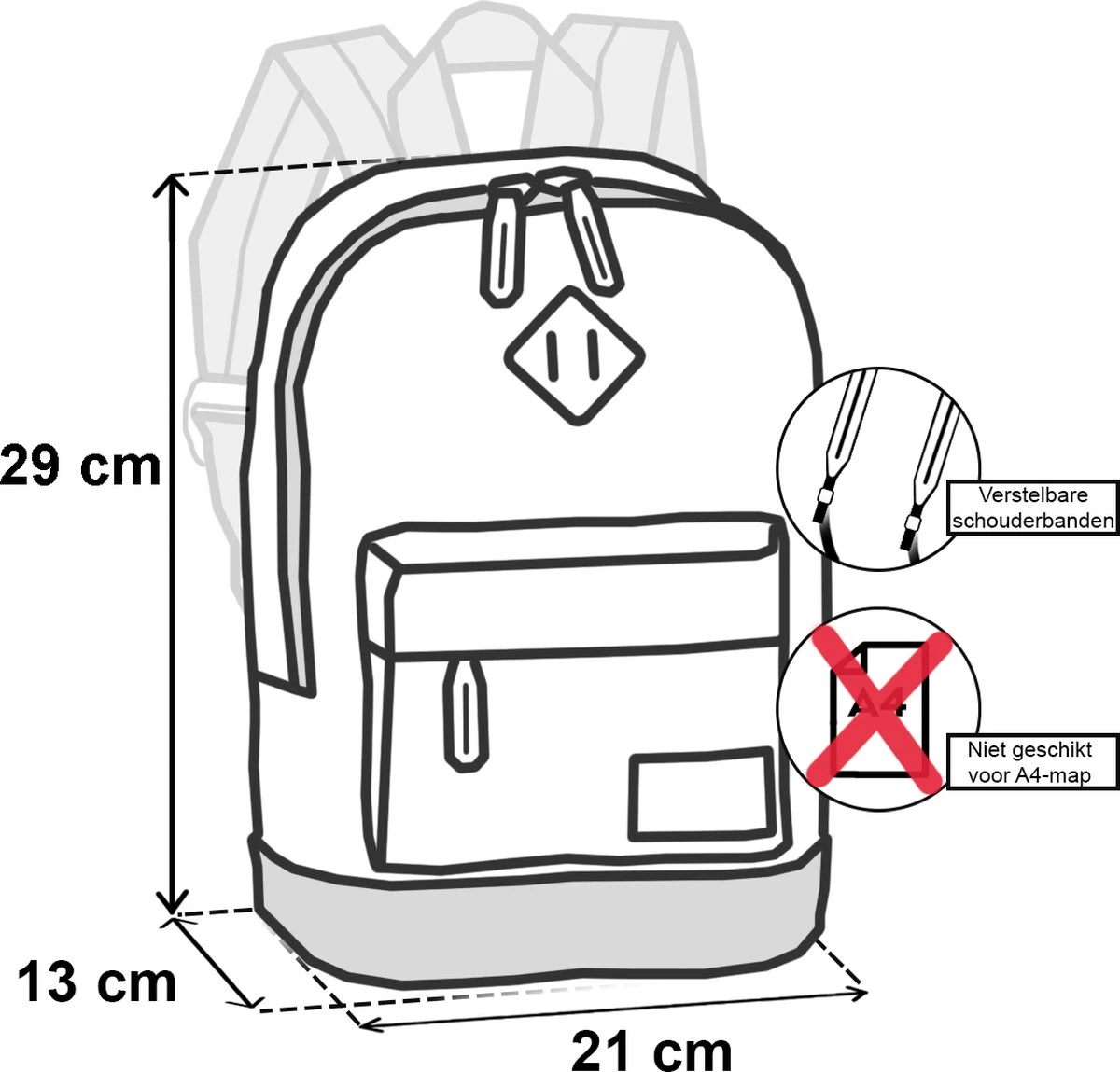 Controleer voor de aankoop de maat die u nodig heeft. Een handige tip is om de rug van uw kind op te meten en te vergelijken met de afmetingen van de rugzak. Let ook op dat tassen aan de bovenkant vaak smaller zijn dan aan de onderkant.