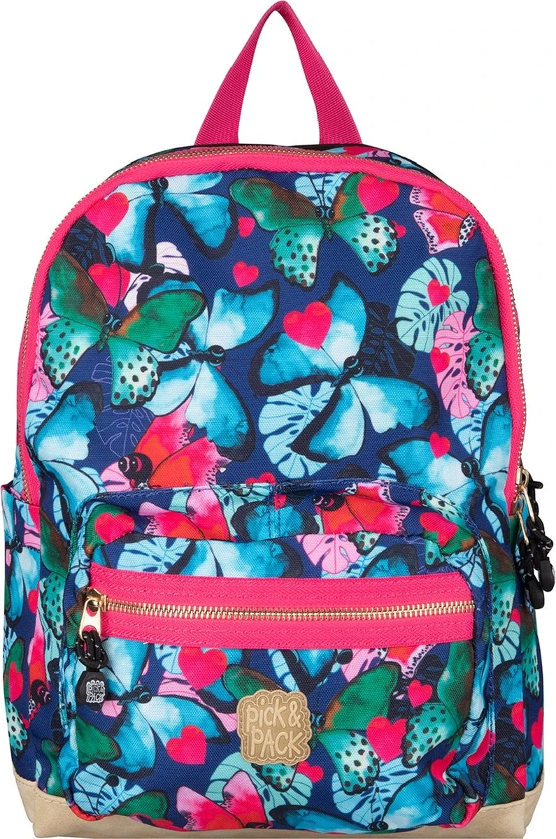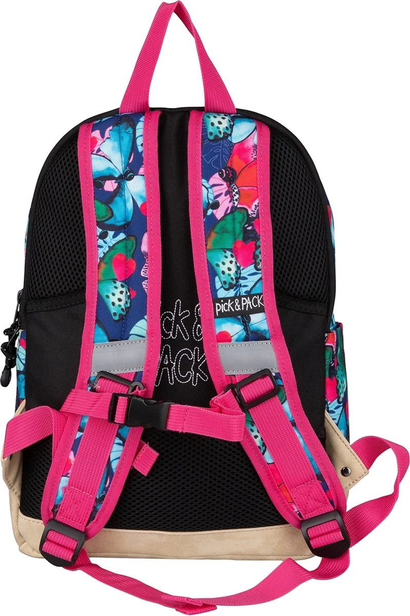 Pick & Pack rugzak in een kleurrijke vlinderprint voor kinderen van 5 jaar en ouder. Dankzij het juiste formaat is de rugtas geschikt voor A4 formaat schoolspullen, een lunchbox en alle andere benodigdheden. Voorzien van een speciaal vak voor een drinkfles. Aan de binnenzijde zit een klein ritsvakje, vakje voor telefoon en een makkelijke sleutelhouder. Met daarop een adres label voor naam, adres en telefoonnummer. Makkelijk voor als de rugtas eens ergens wordt vergeten! Een apart gewatteerd vak is bereikbaar met een rits, hierin kunnen boeken of een 13inch laptop of ipad worden opgeborgen. Voorop een borstbandje om de rugzak stevig vast te maken tijdens het lopen. De rugtas is ook voorzien van kleine reflecterende details zodat je ook in het donker opvalt. Dankzij de gewatteerde schouderbanden en het ergonomische rugdeel is de tas goed door het kind zelf te dragen.
