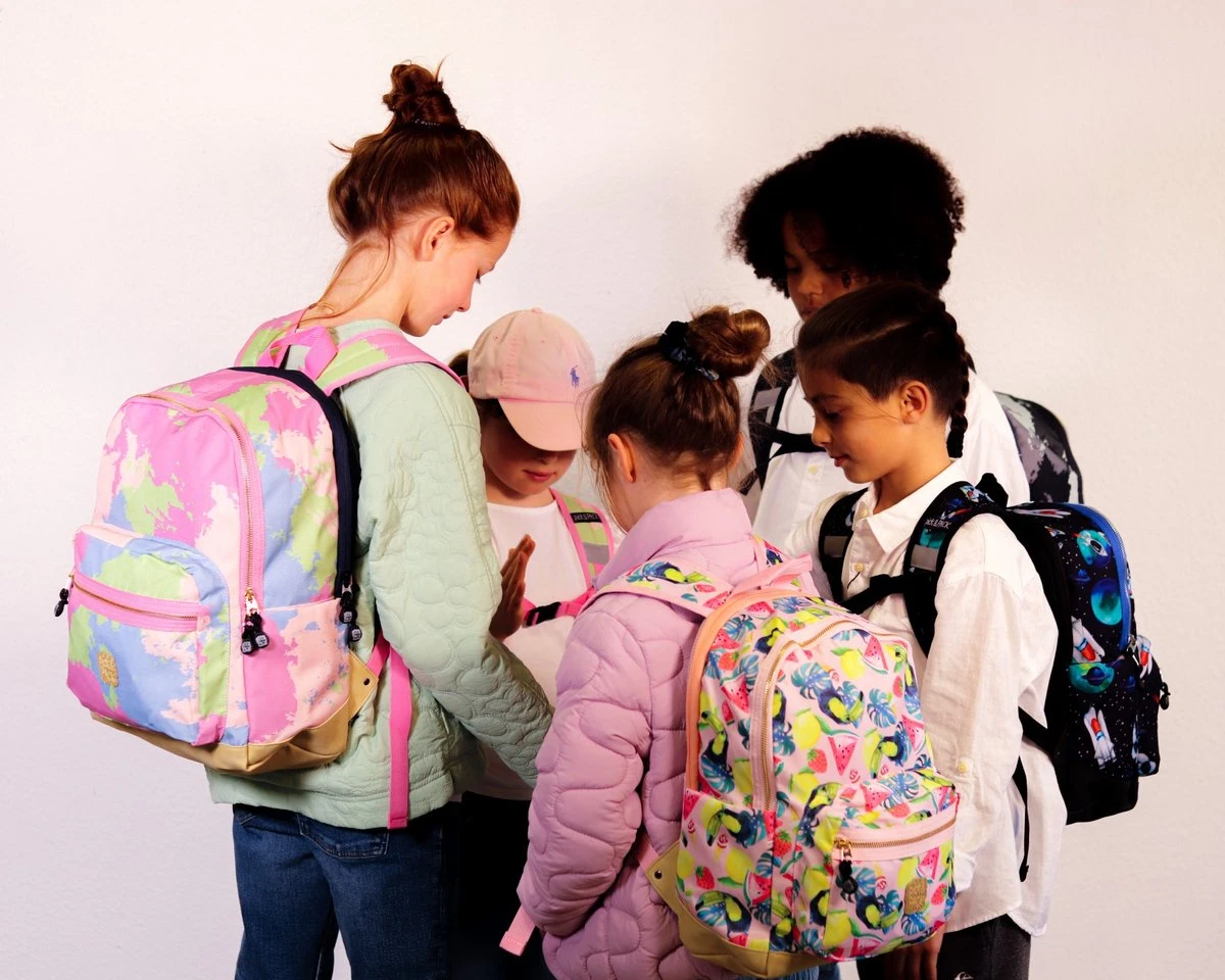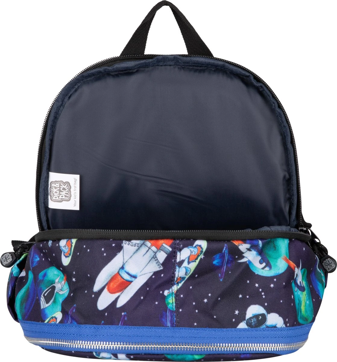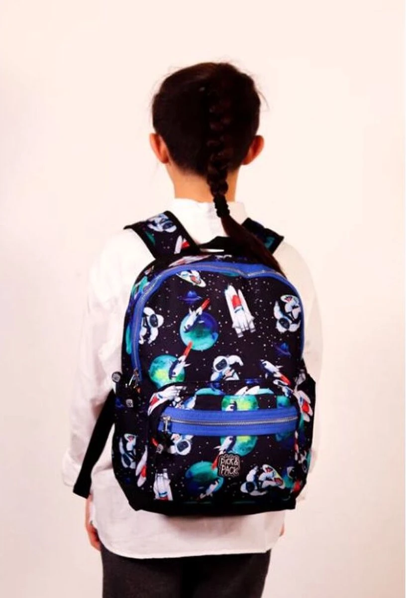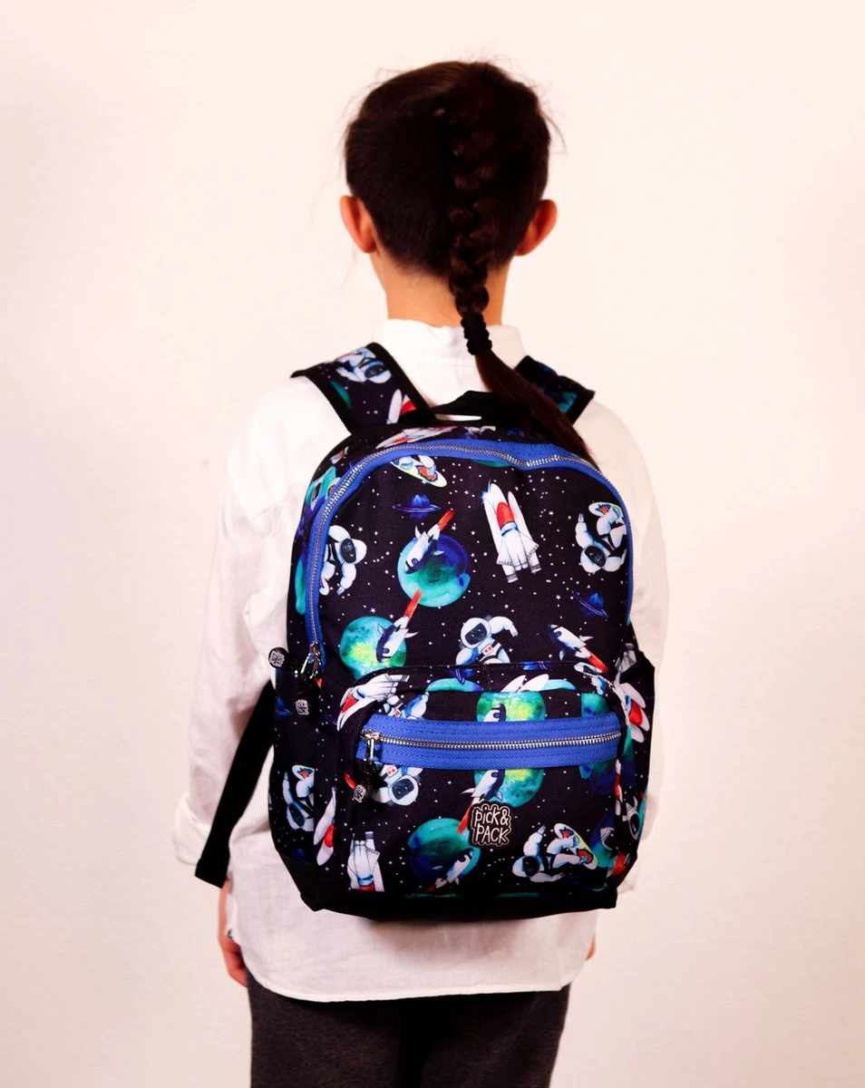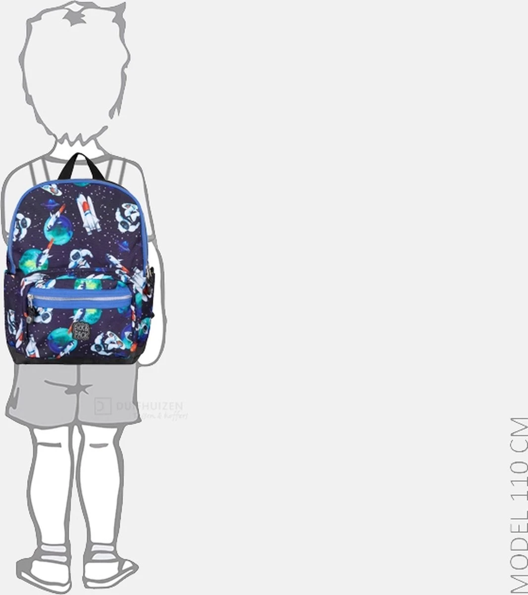 Pick & Pack rugzak in een kleurrijke print met een ruimtemannetjes op skateboord, raketten en de maan voor kinderen van 5 jaar en ouder. Dankzij het juiste formaat is de rugtas geschikt voor A4 formaat schoolspullen, een lunchbox en alle andere benodigdheden. Voorzien van een speciaal vak voor een drinkfles. Aan de binnenzijde zit een klein ritsvakje, vakje voor telefoon en een makkelijke sleutelhouder. Met daarop een adres label voor naam, adres en telefoonnummer. Makkelijk voor als de rugtas eens ergens wordt vergeten! Een apart gewatteerd vak is bereikbaar met een rits, hierin kunnen boeken of een 13inch laptop of ipad worden opgeborgen. Voorop een borstbandje om de rugzak stevig vast te maken tijdens het lopen. De rugtas is ook voorzien van kleine reflecterende details zodat je ook in het donker opvalt. Dankzij de gewatteerde schouderbanden en het ergonomische rugdeel is de tas goed door het kind zelf te dragen.