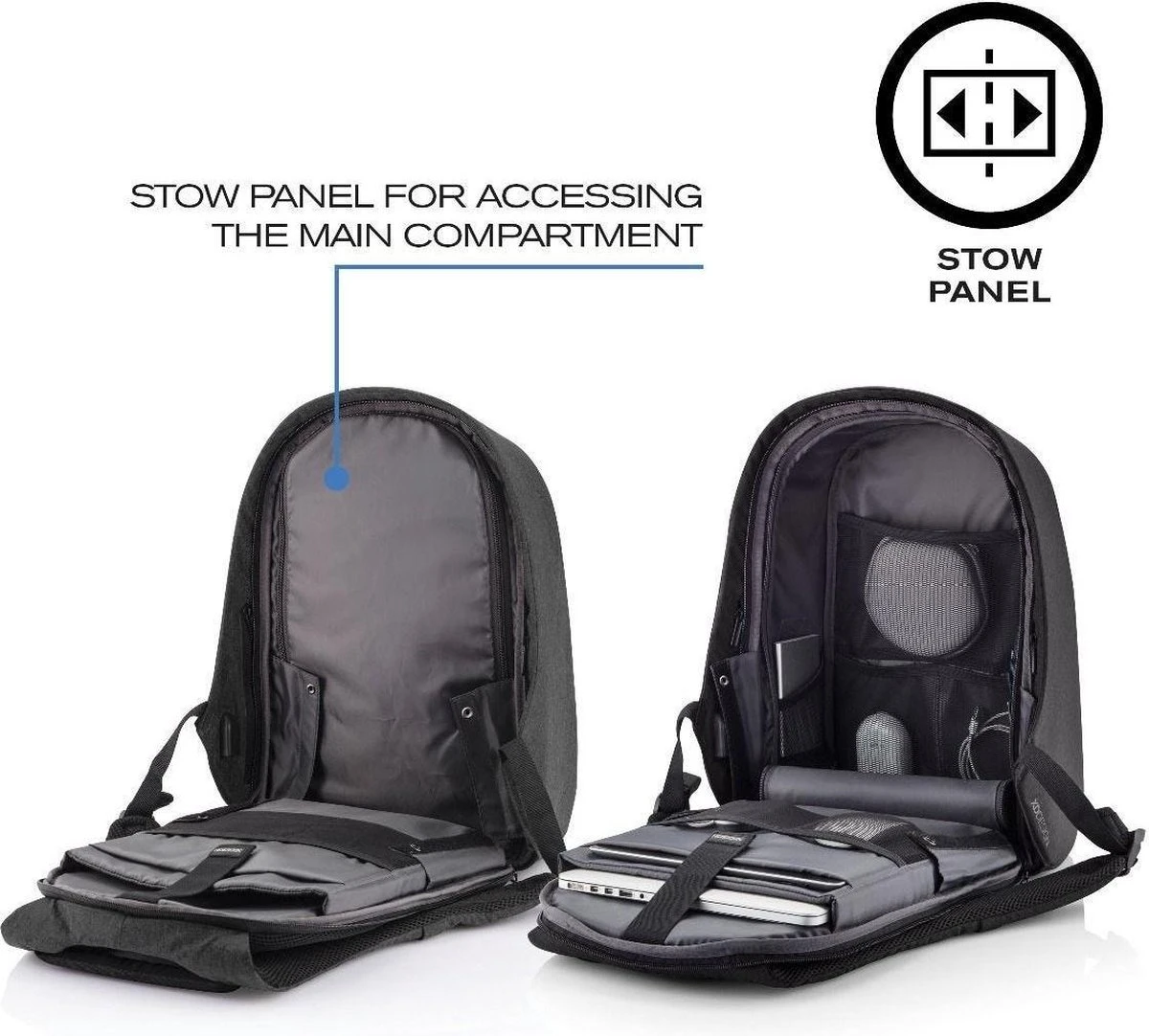 De Bobby Hero tassen zijn de nieuw generatie anti-diefstal rugzakken. Deze nieuwe modellen zorgen dat je veilig, zorgeloos en georganiseerd op weg kan. Met kenmerken als snijbestendig materiaal en verborgen ritssluitingen zijn je spullen veilig. De Bobby Hero heeft daarnaast handige functies als een USB-poort, reflecterende strips en een bagageriem; én de Bobby Hero is waterafstotend. Aan de binnenzijde vindt u gevoerde vakken voor een 17“ laptop, tablet tot 12,9” en al uw andere spullen. De tas is gemaakt van rPET, gerecyclede PET flessen. Geregistreerd ontwerp®